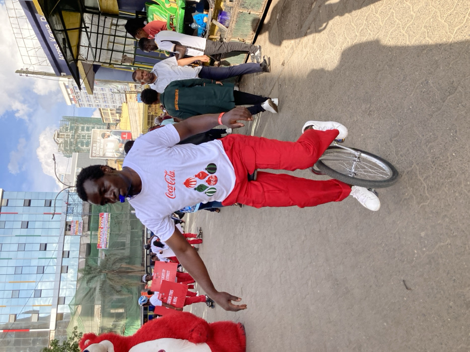 An outdoor scene in Nairobi, Kenya, depicts an urban street event under a partly cloudy sky. In the foreground, a Black male adult, wearing a white Coca-Cola branded t-shirt featuring red, green, and silver holiday ornament graphics, red cargo pants, and white sneakers, actively rides a unicycle. He has a blue whistle in his mouth and extends his left arm forward, with his right foot on a pedal, indicating active balance. To his immediate left, a partial view of a red bear mascot is visible. In the midground, a group of individuals, predominantly dressed in red attire, includes participants on roller skates or skateboards. Several individuals in this group hold red rectangular signs; one clearly reads "CONSIDER THIS A HUG," and another, partially visible, reads "LIGHT UP THE STREET." To the right, adjacent to a street vendor's stall with green seating and assorted items, multiple pedestrians are present. The background features a modern building with a blue glass facade and another structure under construction, covered in green netting with visible banners, one bearing the text "Access Kenya Group." The street is asphalt, exhibiting some wear, and sunlight casts distinct shadows.