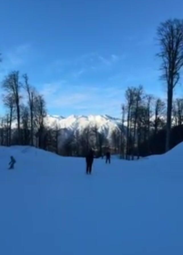 The video depicts a group of skiers on a snowy slope under a clear blue sky