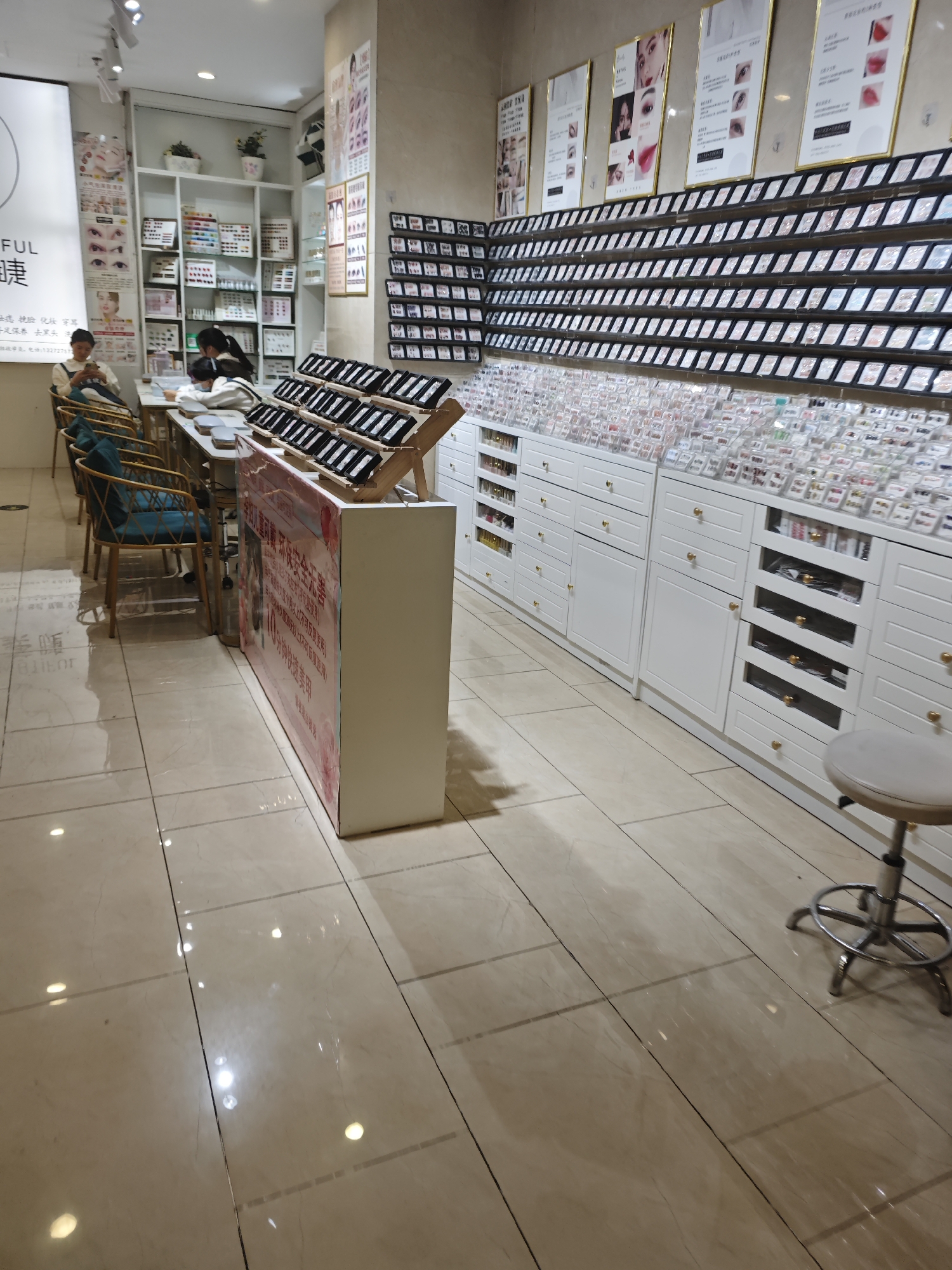 The interior of a beauty salon in Liangjiang, China, presents a scene of cosmetic service and retail. The room is characterized by polished tile floors reflecting ambient light. To the left, two individuals sit at a table engaging in nail care, indicated by the arrangement of nail products. A display stand filled with various nail polishes stands in the foreground, with a promotional sign attached to its side. Behind it, a full wall of storage cabinets and displays dominates the scene. The cabinets, finished in white with gold knobs, house a collection of makeup items. Above the cabinets, mounted displays showcase cosmetic products and promotional images. Finally, to the right, a padded stool sits on the polished floor.