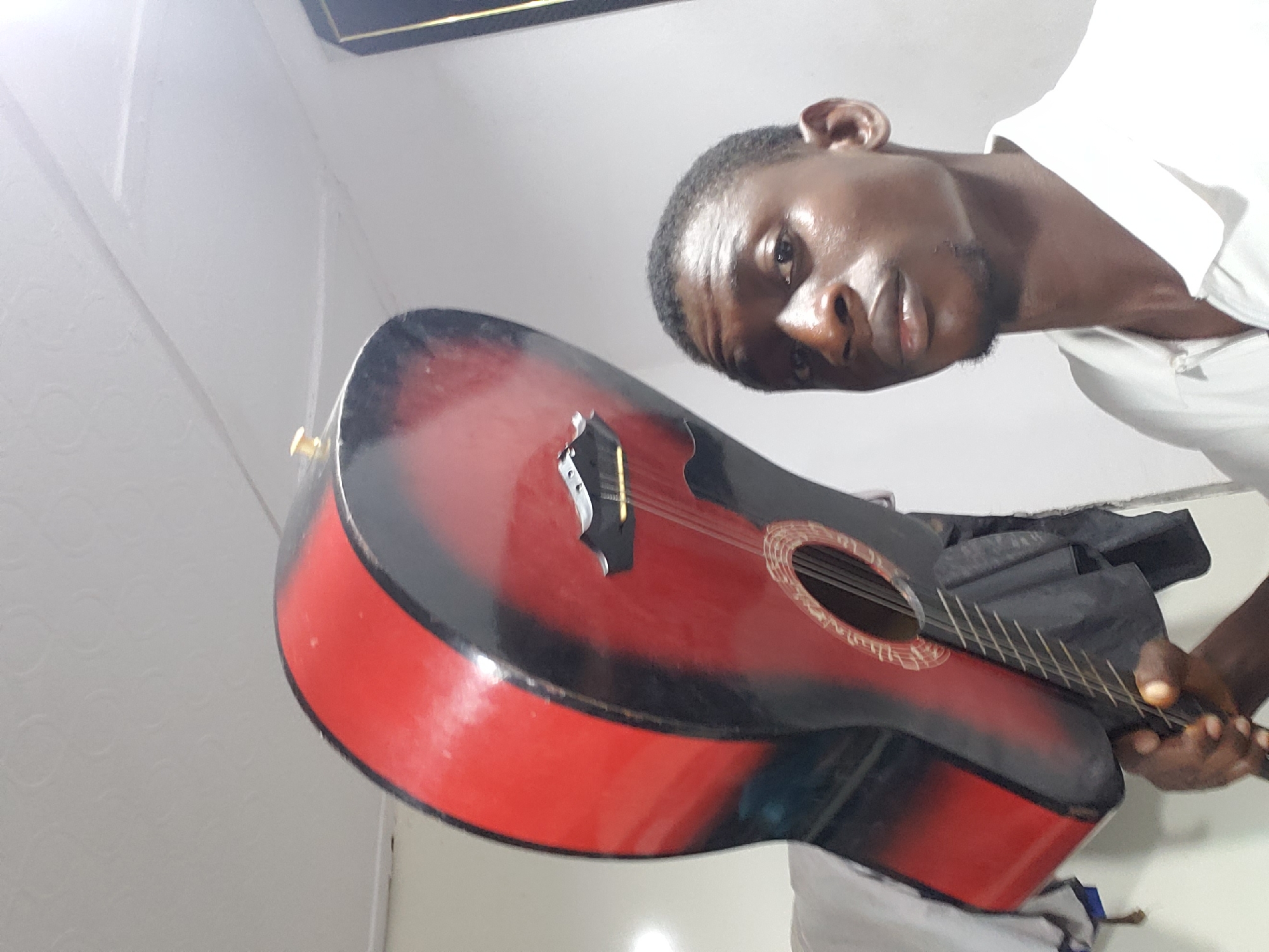 The scene depicts an adult male in an indoor setting within the city of Adankolo, Nigeria. The male, with dark skin and short dark hair, wears a white collared polo shirt and maintains a direct gaze towards the camera. He is positioned slightly to the right of the frame's center. A red and black gradient acoustic guitar is prominently held vertically in the foreground, partially obscuring the male's left side and much of the background. His left hand grips the guitar neck near the bottom. The immediate background consists of plain, light-colored walls and a white ceiling featuring a faint patterned texture. To the left, behind the guitar, light-colored fabric or clothing is draped over an unseen object. To the right, a dark, vertical structure, possibly a framed object or part of a doorway, is partially visible. The lighting appears artificial and uniform.