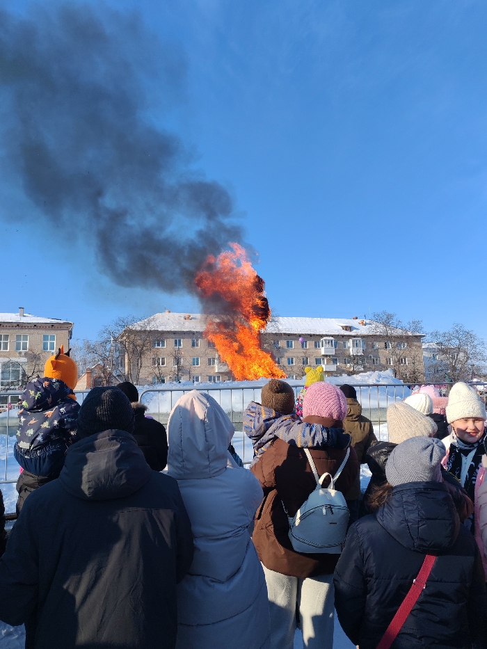 This image captures an outdoor winter event in Chaikovsky, Russia, centered around a large bonfire witnessed by a crowd. In the foreground and midground, approximately fifteen to twenty individuals, including adults and children, are gathered, predominantly viewed from behind, observing the bonfire. They are dressed in heavy winter clothing, including various colored knitted hats (e.g., orange, pink, brown, white, grey), hooded jackets, and coats. A child with an orange, horned hat is visible on the far left, and another child is being carried on an adult's shoulders. On the far right, a girl wearing a white knitted hat smiles towards the camera. The spectators stand on snow-covered ground, separated from the central activity by a light-colored metal barrier. The focal point is a large bonfire in the midground, producing intense orange flames that rise vertically and a thick, dark grey to black plume of smoke ascending into a clear blue sky. The bonfire appears to be consuming a substantial effigy or structure. In the background, multi-story buildings with light-colored facades and numerous windows are visible behind the fire, their roofs covered in snow. Bare trees are interspersed between the structures. The ground throughout the scene is covered with snow, indicative of a winter environment. The clear blue sky and visible shadows confirm daytime conditions.