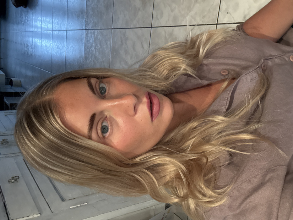 An adult female is depicted in a chest-up, forward-facing orientation within an indoor setting in Wattrelos, France. She possesses long, wavy blonde hair with lighter highlights, blue eyes, and dark, defined eyebrows. Her complexion is tanned, and her lips are parted, showing a light pink hue. She wears a collared shirt in a light brown or mauve tone, with several visible buttons down the front. The background to the upper left features a distressed light-colored wooden cabinet with metal handles. The background to the right and occupying the lower portion of the frame consists of a light-toned tiled floor with visible grout lines, exhibiting areas of reflectivity. No other individuals or specific identifiable objects are present.