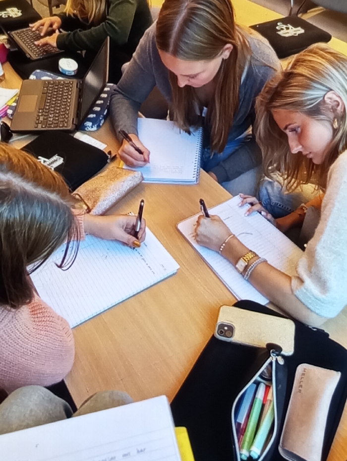 The scene is located in Mrozów, Poland. Four individuals are present at a light-colored wooden table within an indoor environment. In the upper-left, a partially visible individual, wearing a dark green long-sleeved garment, is operating an open laptop. Adjacent to this, a dark grey laptop is open on the table, along with a small white circular container. In the center-upper frame, a female with long brown hair, dressed in a grey long-sleeved top and blue jeans, is observed writing in a spiral-bound notebook using a black pen. To her right, a female with blonde hair, wearing a light-colored long-sleeved top and blue jeans, is writing in a spiral-bound notebook with a black pen. Her left wrist bears a gold-toned watch and multiple bracelets. An iPhone, encased in a gold glittery case, rests on a black laptop sleeve. A transparent pencil case containing various colored markers and a light brown case labeled 'MELLER' are positioned nearby. In the lower-left foreground, a partially visible female, with brown hair, wearing a pink knitted sweater and grey pants, is writing in a lined notebook with a black pen. Her fingernails are painted gold. A yellow sheet of paper is visible beneath her notebook. All four individuals are actively engaged in individual study tasks involving either writing in notebooks or typing on a laptop.