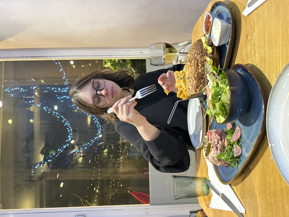 A person with glasses sits at a table next to a window decorated with lights. They hold a fork in their right hand and appear to be eating fries. On the table are two blue plates. One plate holds a burger, fries, and two small bowls of condiments. The other plate contains a salad and a small serving of meat. A glass of white wine and a drinking glass are also on the table.