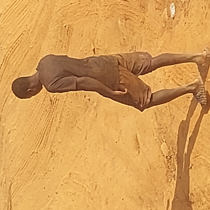 A man lies prone on parched, tan earth. He's dressed in shorts and a t-shirt, both appearing dusty. His head is turned to the left, and his arms are bent at his sides. His legs are stretched out, with one foot slightly turned outward. A distinct shadow trails off from his body to the right, indicating a strong light source. The ground's surface shows tracks and patterns, suggesting previous activity.