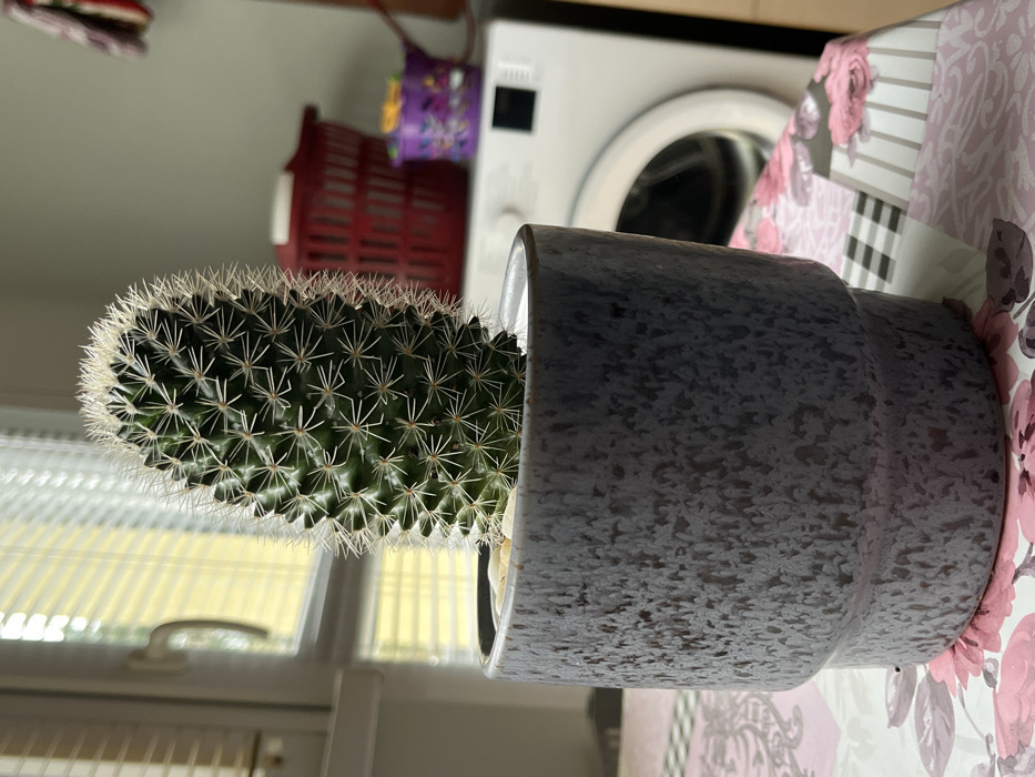 The image displays an indoor scene located in Veliko Tarnovo, Bulgaria. A green, columnar cactus, densely covered with sharp white spines, is centrally featured, planted in a gray, textured ceramic pot. Small white pebbles are visible on the soil surface within the pot. The pot rests on a patterned tablecloth featuring pink and purple floral designs interspersed with a checkered pattern. In the background to the left, a window with light-colored horizontal blinds is partially visible, allowing ambient light into the room. To the right in the background, a white front-loading washing machine is present, with its circular door and controls partially visible. On a surface above or behind the washing machine, a red plastic laundry basket with a perforated design is visible, alongside a smaller purple plastic basket with decorative cut-outs. No individuals, direct actions, or interactions are depicted in the scene.
