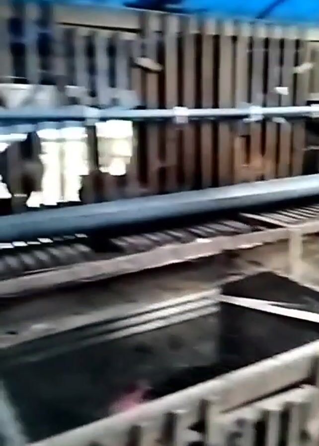 rows of caged poultry. The cages are constructed of metal and wood, with a system of pipes running along the top. White eggs are visible on the floor of the cages. A rooster's crow is heard at the beginning of the video. The camera is positioned within the cages and moves along the rows. The environment appears to be a farm or agricultural setting.