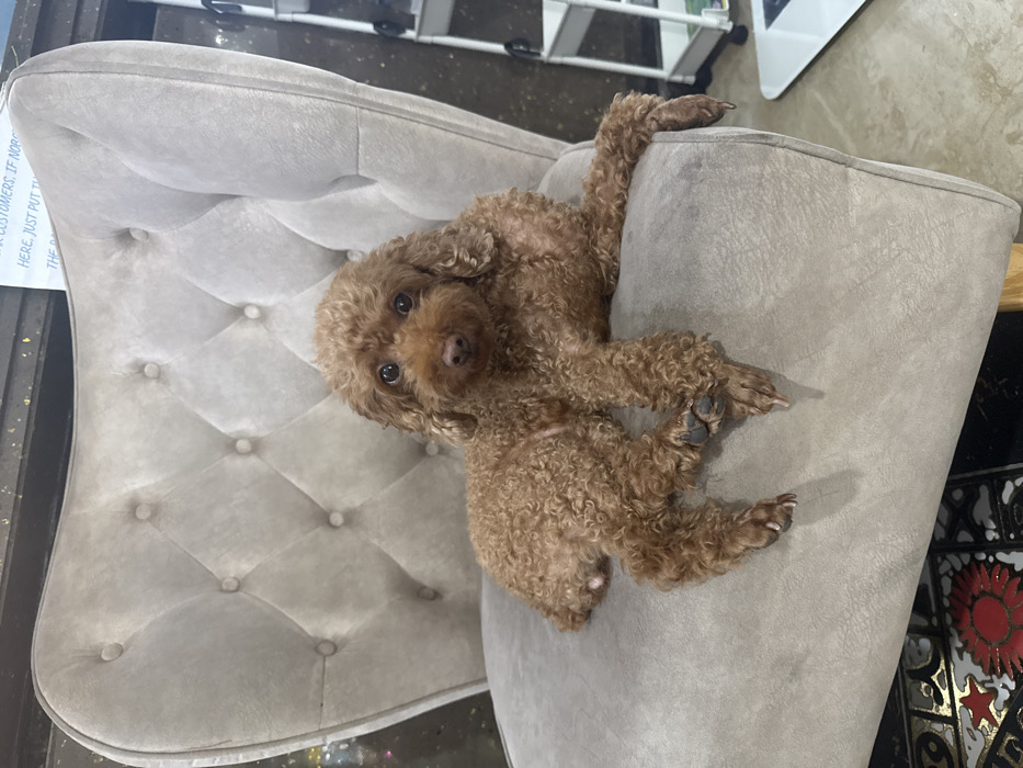 - "A reddish-brown poodle-type dog with curly fur is positioned on a light grey upholstered armchair, facing the viewer" by FM-LrASw2, licensed under CC BY 4.0