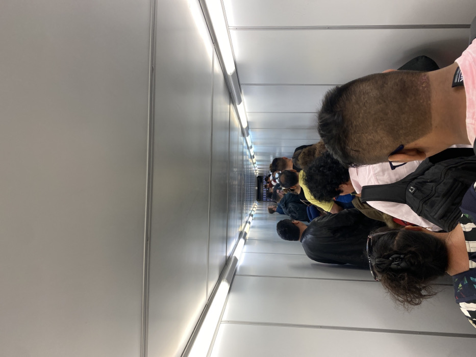 - "long line of people inside an enclosed tunnel, likely at Jorge Chávez International Airport in Callao, Peru (latitude: -12" by FM-ktffx2, licensed under CC BY 4.0