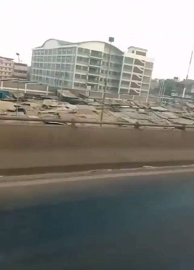 From a vehicle driving on a highway, the camera captures a view of a city scene. In the foreground, there is a concrete barrier that divides the highway. Beyond the barrier, there is a densely packed area that appears to be a market or commercial district. The buildings in this area vary in size and construction; some look temporary, while others are multi-story and more permanent. A billboard advertising someone as a "KOGI INVESTOR" is visible. The sky is overcast, giving the scene a muted, slightly hazy appearance. There is some movement of people and vehicles within the scene, but it is not prominent.
