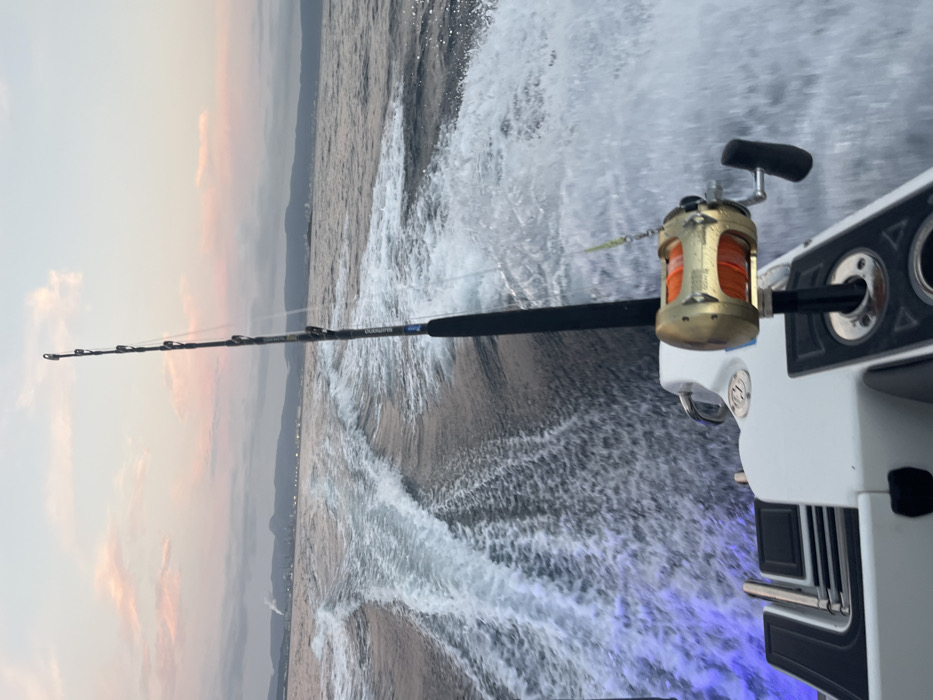 A fishing rod extends horizontally across the frame, mounted to the side of a white boat