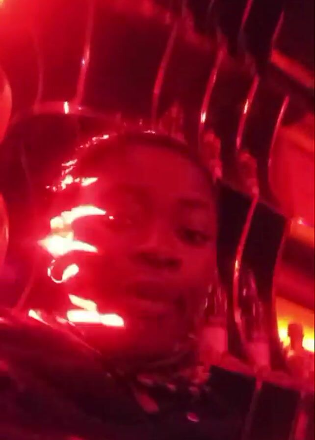 A person with dark skin and dark braids wears wireless earbuds while recording themselves in a red-lit room. A silver, decorative bottle rack is visible in the background. The person moves their hand and sticks out their tongue slightly. The video ends with a bright flash of light.