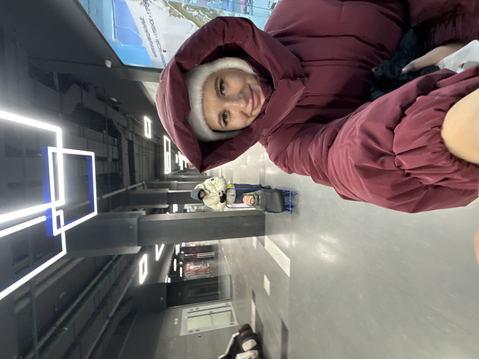 A woman in a maroon winter coat and white hat smiles at the camera, holding a black dog. She appears to be in a modern indoor space with grey flooring, bright, angular lights, and glass-fronted shops. In the distance, a person in a tan jacket sits on a bench with luggage on a trolley. The image is oriented vertically.