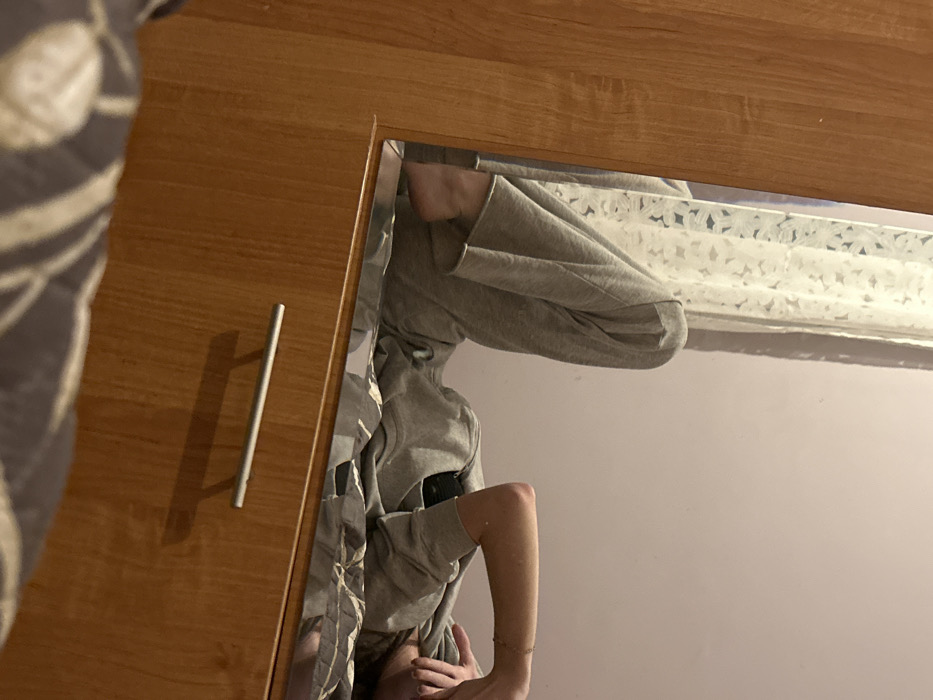 A person is reflected in a mirror attached to a wooden closet or cabinet. The individual wears a gray hooded sweatshirt and is positioned partially in the frame, facing the mirror. The mirror reflects a white floral patterned curtain and a blank wall behind the subject. The frame around the mirror is wooden and matches the cabinet. A silver handle is on the front of the cabinet, casting a shadow.