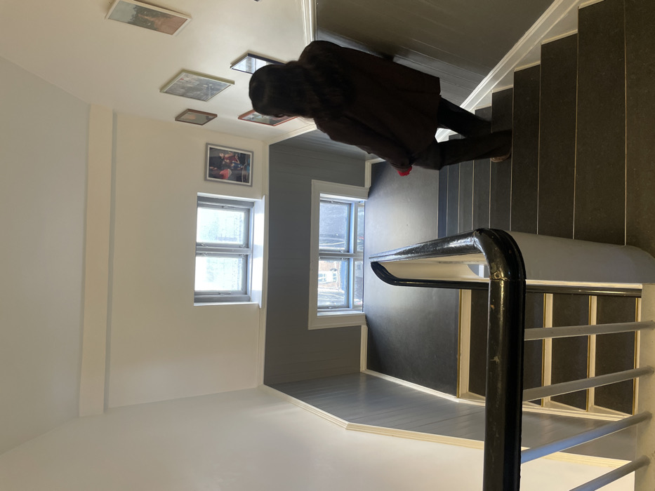 This interior image, likely taken in a building in Frederiksberg, Denmark, depicts a stairwell. A single individual, viewed from behind, is descending a set of dark grey stairs with white risers and thin gold-colored strips at the edge of each tread. The person wears dark trousers, brown shoes, a dark brown long-sleeved top or jacket, and a red glove or sleeve on their left arm. Their dark hair is shoulder-length and wavy. The stairwell features walls painted in two horizontal sections: the upper portion is white, while the lower portion is grey paneling, separated by a white dado rail. A dark black handrail with a white base and balusters is present on the left side, following the descent of the stairs. Two rectangular windows are visible on the far wall; the upper window is higher and smaller, while the lower window is wider and offers a view of what appears to be a street scene with buildings and possibly a vehicle. Several framed pictures of varying sizes are hung on the white upper wall section to the right of the individual. The floor at the landing below the current stair section is dark grey.