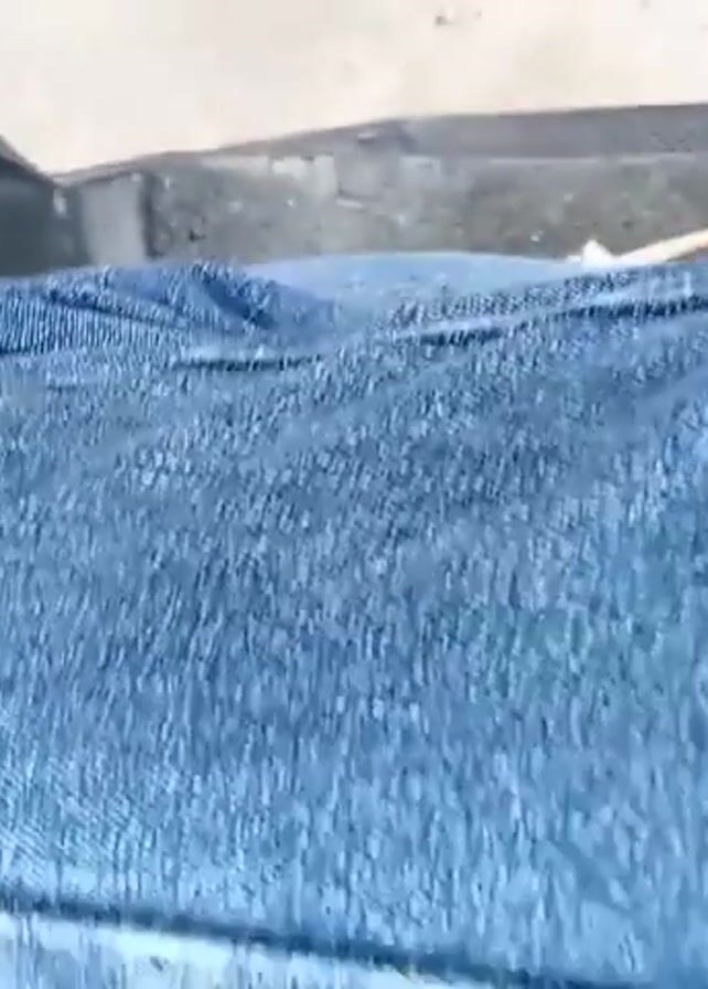 person's thigh, covered in blue jeans, resting on a black scooter seat. A portion of a pink and white plaid shirt is visible along the side of the thigh. The camera is close, focusing on the denim texture. Outside of the seat, the ground is visible. The camera is stationary. Sounds of traffic can be heard.