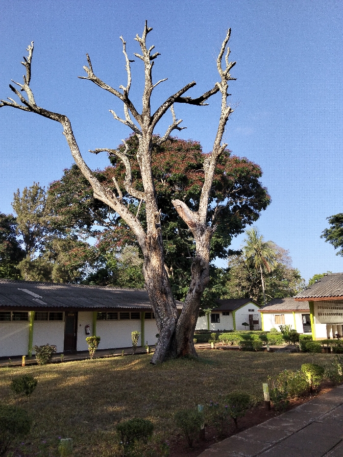 A striking, leafless tree dominates the scene, standing in front of a cluster of low buildings with white walls and gray roofs. A mix of green foliage and trees provides a backdrop, partially obscuring the buildings. The foreground features neatly trimmed bushes and a patch of dry grass, bathed in sunlight. A walkway extends into the bottom right corner. The sky is clear and blue.