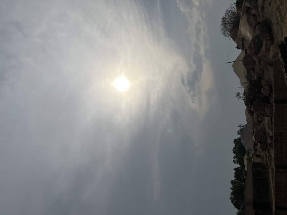 An outdoor wide shot captures a partially overcast sky with the sun brightly diffused through clouds in the upper right quadrant