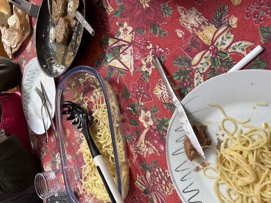 A table is depicted from a high-angle perspective, set with a red tablecloth featuring a festive pattern of green holly, red poinsettias, gold lanterns, and candles, indicative of a holiday season. The scene is located in Santa Maria da Feira, Portugal. The table is laden with remnants of a meal. A large clear glass rectangular baking dish occupies the center-left, containing a substantial amount of yellow spaghetti with a black and white spaghetti server resting inside. To its right, a black frying pan holds three brown, circular meat patties submerged in a light brown gravy, with a silver spoon partially immersed. In the lower foreground, a white plate with a black wavy rim contains a small portion of spaghetti and a partially consumed brown meat patty. A silver table knife rests across this plate. Further back and to the left, another white plate with a similar wavy rim is mostly empty, holding a silver fork and a silver spoon. A clear glass tumbler containing water is positioned behind the spaghetti dish. In the upper-left background, the left arm and shoulder of an individual, dressed in a dark green or brown textured garment, are visible. A flash of magenta fabric is also visible, suggesting another person or a vibrant accessory. A crumpled brown paper bag, possibly containing bread, is visible in the upper-right background. The overall scene suggests a family meal, recently consumed or ongoing, with dishes still on the table.