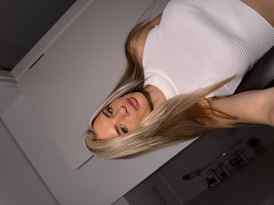 The image displays a close-up portrait of a female subject, positioned indoors. The subject has long, straight, blonde hair with visible roots or darker highlights, blue eyes, and full lips, directly facing the camera with a slightly tilted head and a neutral to slightly pouting expression. She is wearing a white, ribbed, high-neck, sleeveless crop top. Her right arm and hand are partially visible in the lower right corner, suggesting she is holding the camera for a selfie. The background to the right features a light-colored, plain wall with a white door, possibly a flush or sliding type, visible from mid-frame upwards. To the left of the subject, the background is darker but reveals elements consistent with a bathroom environment: a silver showerhead with a hose and a multi-tiered shower caddy affixed to a wall, holding several bottles. The walls appear light grey or off-white. The lighting is uneven, illuminating the subject brightly while the left side of the background remains dim. The specific location within the city of Berlin, Germany, cannot be determined from the visual information presented in this image. The scene is consistent with a private domestic interior, specifically a bathroom or a room immediately adjacent to one.