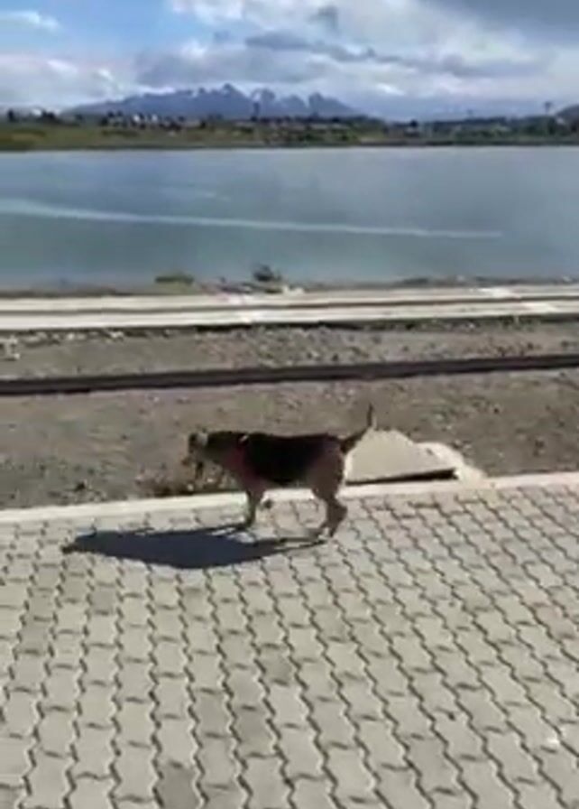 A medium-sized dog trotting right to left along a paved area with a stick in its mouth, the background shows a body of water with mountains in the distance. A woman in a camouflage jacket and jeans walks along a paved promenade, holding a phone. The backdrop features a scenic view of a bay, mountains, and a town.