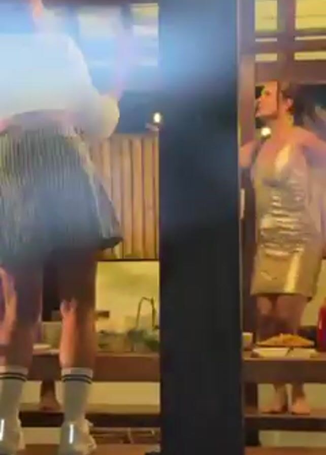 two women dancing outside at night, likely in a gazebo. The woman on the left is wearing a short checkered skirt, a white crop top, and white sneakers with striped socks. She has short brown hair. The woman on the right is wearing a short gold dress and earrings, with her hair in pigtails. Both women are smiling and appear to be enjoying themselves. There are plates and cups on the table in the gazebo, and strings of lights are visible in the background.