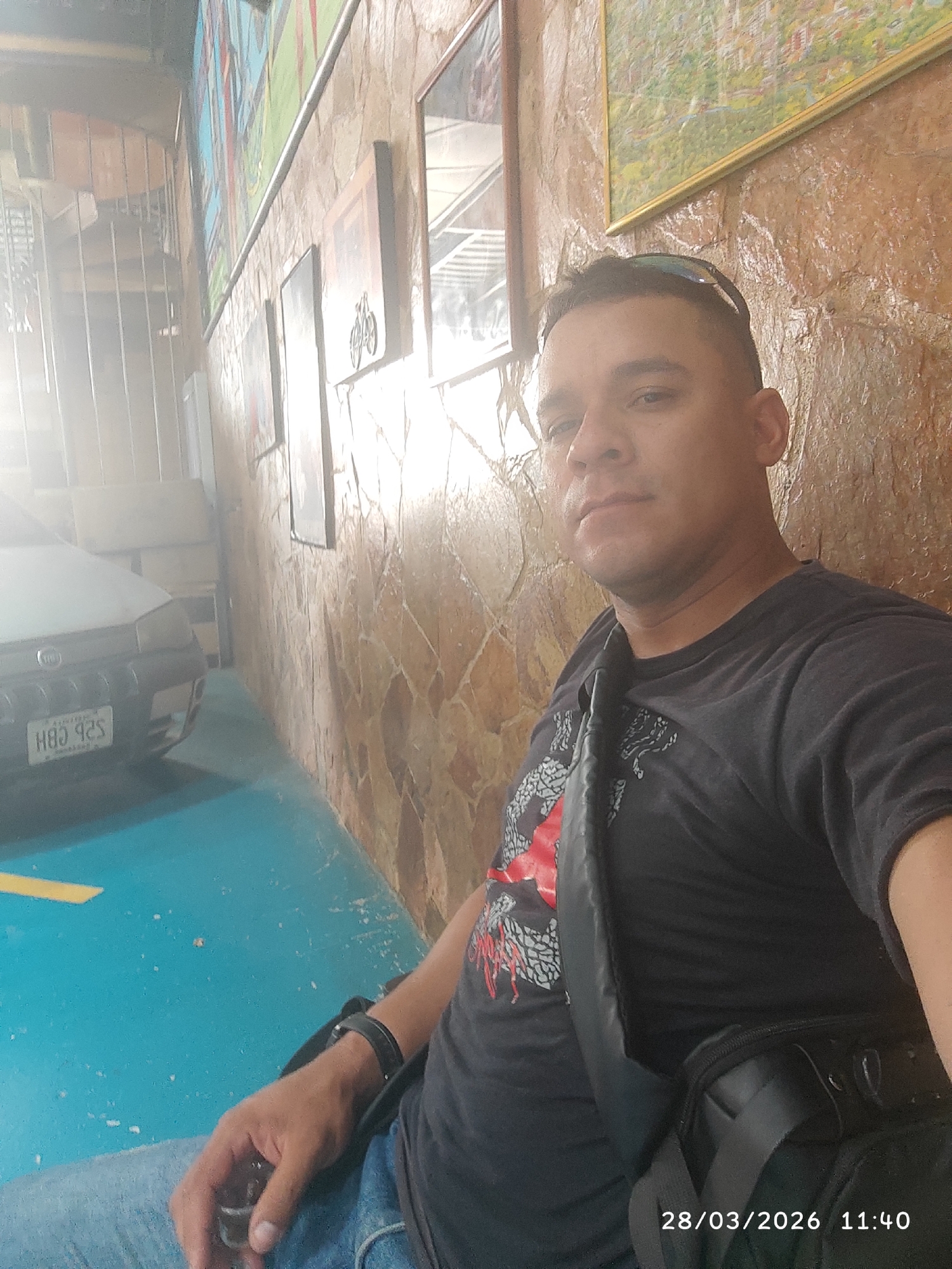 A man is sitting indoors. The man is wearing a dark t-shirt with a graphic, jeans, and a watch, and has a black bag slung over his shoulder. He has sunglasses resting on top of his head. He is looking at the camera. Behind him is a wall covered in a stone-like texture, with several framed pictures hanging on it. To the left of the man, a car is partially visible. The floor is painted blue. The location appears to be Valencia, Venezuela. The time stamp reads 28/03/2026 11:40.