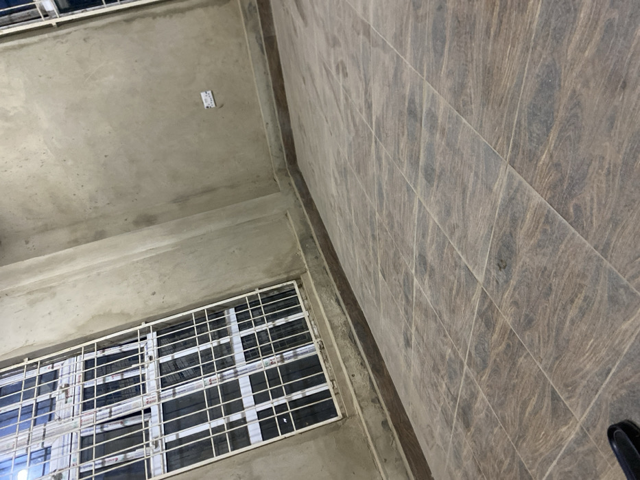 An indoor view shows a stark contrast between materials. The ceiling and wall around a window are raw, unfinished concrete. A white, barred window sits within the concrete frame. Adjacent, the wall is covered in patterned, greyish-brown tiles laid diagonally. The tiling creates a textured visual, in contrast to the flat, unadorned concrete surfaces.