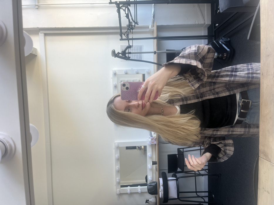 A young adult female is depicted taking a mirror selfie in an indoor setting. She has long, straight blonde hair and is wearing a light-colored plaid button-up shirt, a black tank top, a white undershirt, blue jeans, a dark belt with a silver buckle, a silver ring on her left ring finger, and a beaded necklace. Her left hand holds a light purple smartphone with a patterned case, angled to capture her reflection, while her right hand is slightly raised. The background, as reflected in the mirror, reveals a room resembling a dressing room or studio. A light-colored wooden counter extends across the scene, topped on the left side with a black quilted handbag, a white paper bag, two spray bottles, and a tissue box. Two black high-backed stools are positioned in front of this section of the counter. Above the counter, two white-framed vanity mirrors, each encircled with exposed light bulbs, are mounted on a plain white wall. To the right, a black garment rack holds several empty black clothes hangers. A black clothing steamer on wheels is visible behind the garment rack. The room features white walls, a dark floor, and a circular ceiling fixture reflected overhead. The image lacks visual identifiers to pinpoint its precise location within Minsk, Belarus.