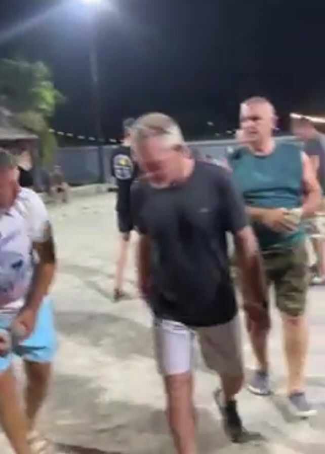 At night, several people are playing a game that looks like bocce ball on a concrete surface. The area is lit by overhead streetlights. The first man is wearing a white t-shirt and light blue shorts, and sandals. He is bending over and picking up a ball. The second man is wearing a black t-shirt, black shorts, and sandals, and is walking towards the game. The third man is wearing a black t-shirt and pink shorts. He is standing in a yellow circle, holding a silver ball. He takes a step forward and tosses the ball. There are more people watching the game in the background. There is a building with a tin roof in the background, and a carnival-like light pole.