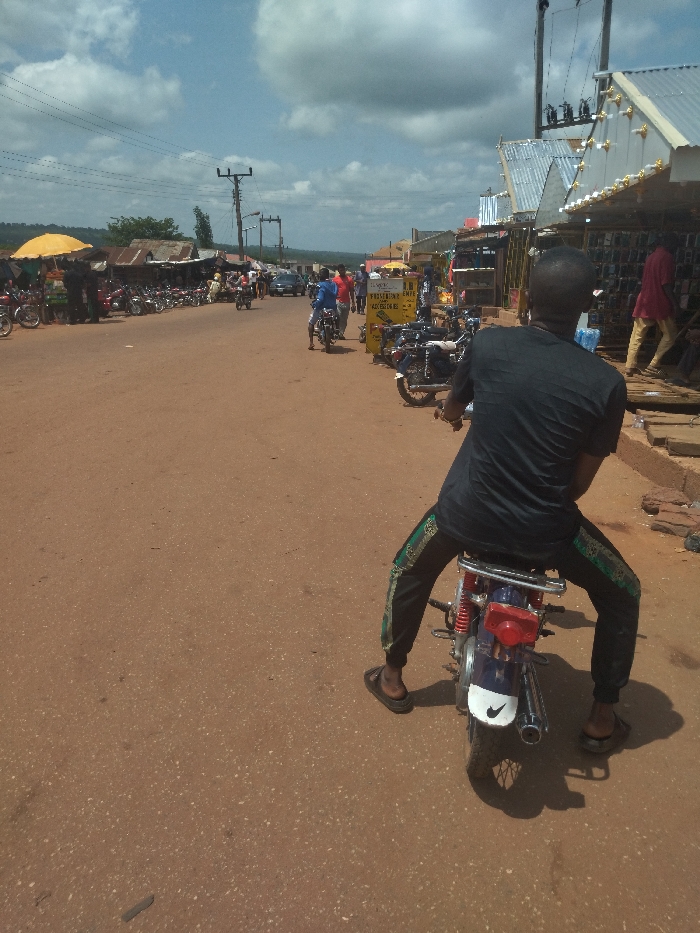 The scene takes place on a dirt road in Lokoja, Nigeria, at latitude 7.404 and longitude 7.632. It is a bright day with a few clouds in the sky. There are several people in the scene, including a man riding a motorcycle. There are also several motorcycles parked on the side of the road, along with a few shops and buildings. The man on the motorcycle is wearing a black shirt and pants, and is looking forward. He is riding a blue motorcycle with a white Nike swoosh on the back fender. The road is made of dirt and gravel, and there are power lines running overhead. There are also some trees and bushes on the side of the road.