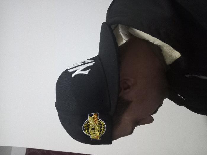A man wears a black baseball cap with a white stylized "N" on the front and a round emblem with yellow and black detailing on the side