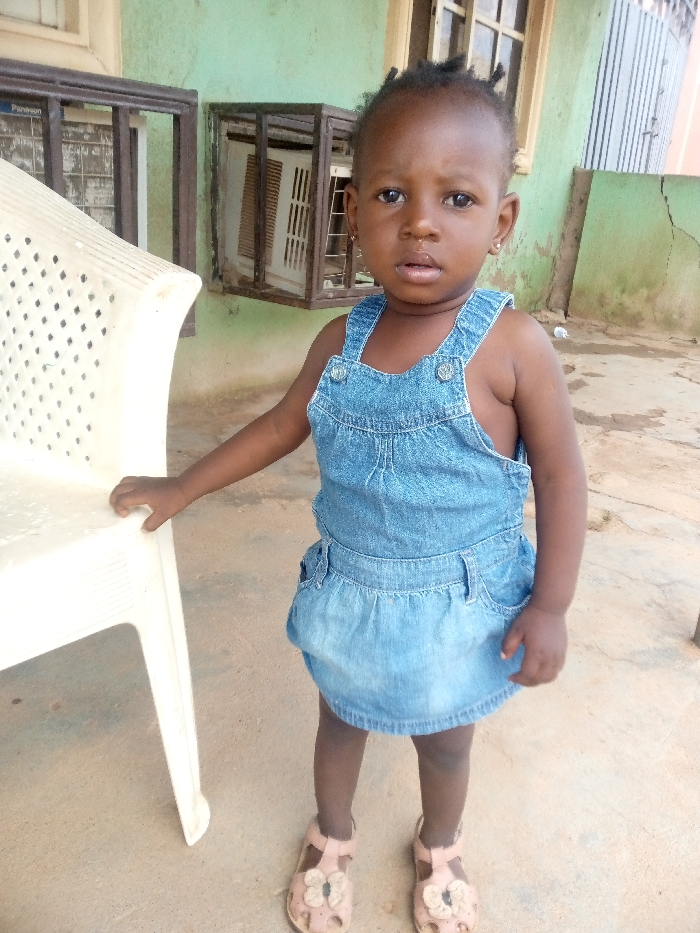 The image captures a young child standing outdoors in Sabon Tasha, Nigeria
