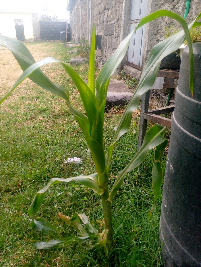 A corn plant stands prominently in a grassy area. It has a thick stalk and several green leaves sprouting from it. A black plastic water tank is to the right, partially obscuring the view. A concrete building and a white building are visible in the background, along with some green grass. The scene is captured on a somewhat overcast day.
