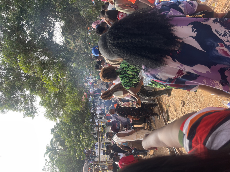 The image depicts a densely crowded outdoor social gathering in Abuja, Nigeria, during daylight hours under a bright sky
