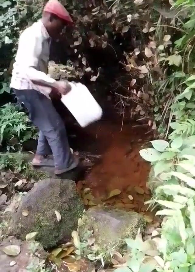 A man wearing a light-colored striped shirt, dark trousers, and a red cap is shown in a small, thickly-wooded area. He's carrying a white plastic container. He seems to be near a small, possibly natural pool of water that is a reddish brown color. He pours the contents of the container into the water. He then walks away, deeper into the woods.