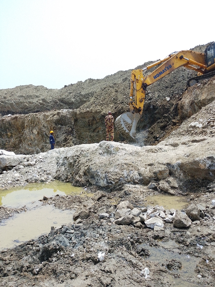 This image depicts an open-pit excavation site in Otulu, Nigeria, under a bright, overcast sky