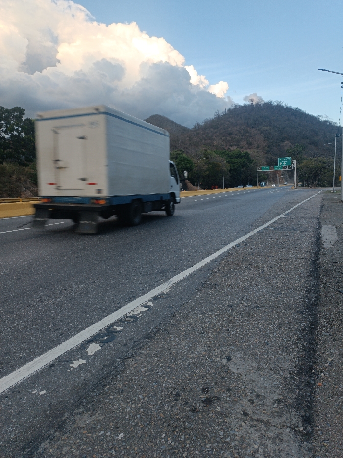 A white delivery truck speeds along a highway. The road is gray asphalt with a white painted line marking the lane. A hillside covered in dry brush rises in the background under a partly cloudy sky. Roadside vegetation lines the highway. A highway sign is visible in the distance. The road surface shows signs of wear and tear.