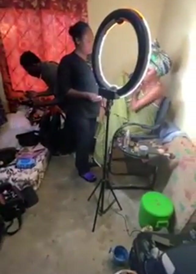 The video depicts a cluttered room with several people present. There is a bed with items scattered on it, and various bags and objects are strewn across the floor. A ring light on a tripod is visible, suggesting a possible filming setup. The individuals are seen moving around and interacting within the room.