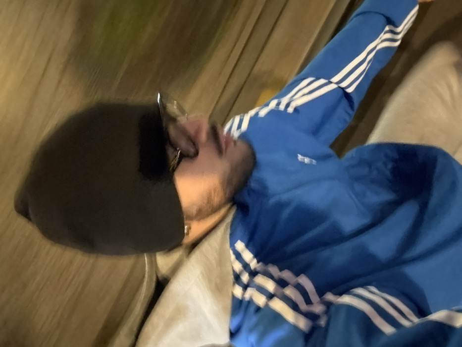 A blurry close-up shows a person wearing a black beanie, wire-rimmed glasses, and a blue Adidas tracksuit with white stripes. The person appears to be lying down, with the side of their face visible. The background is indistinct, suggesting motion blur. The camera is angled slightly. The clothing and accessories are distinct despite the blur.