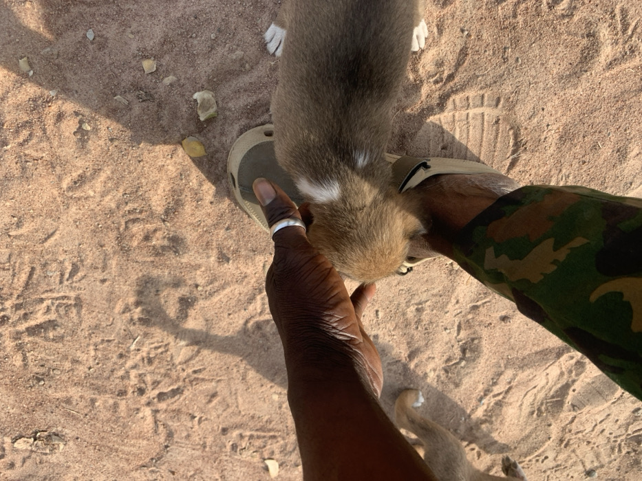 A top-down view shows a person wearing camouflage pants and a silver ring, interacting with a small puppy. The puppy is brown and grey and appears to be investigating the person's sandal-clad foot. The setting appears sandy, with faint footprints visible near the foot. The person's hand is gently touching the puppy. Another puppy is partially visible in the background. The sunlight casts shadows across the ground.
