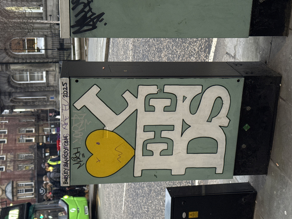 A light green utility box with black trim displays graffiti. "I heart NHS" is painted in white with a yellow heart replacing "heart". Additional graffiti, including "BURLEY BANKSY/GOKS ARE FU 2025", is scrawled near the heart. A gray stone building with arched windows is visible in the background, along with a green double-decker bus and pedestrians. Another utility box with graffiti stands above.