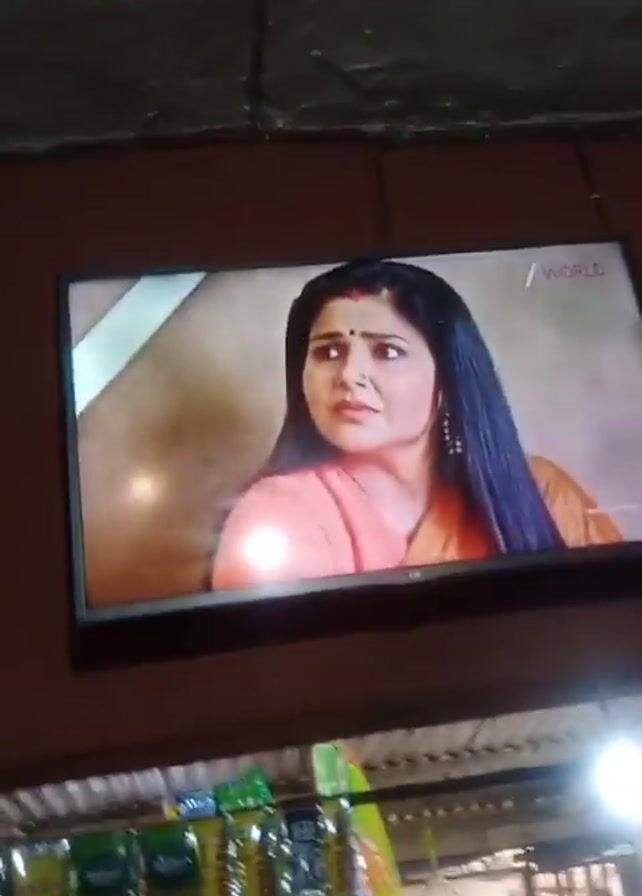 Here's a detailed description of the video: The video shows a television mounted on a wall in what appears to be a small shop or business. The TV is displaying a scene from a drama, likely a soap opera. Initially, a woman with long, dark hair, wearing a peach-colored outfit and a red bindi on her forehead, is shown looking concerned. The camera angle is slightly tilted upwards towards the TV. The scene then cuts to a man with curly hair wearing a blue jacket. He is shown kneeling and working with some equipment that is emitting blue light. Next, the woman from the first scene appears next to him, seemingly to confront him or understand what he is doing. Below the TV, a display rack with various items is visible, including packets of "CHEW ROK" and "NEE TREE" chewing gum. The ceiling above is made of corrugated metal.