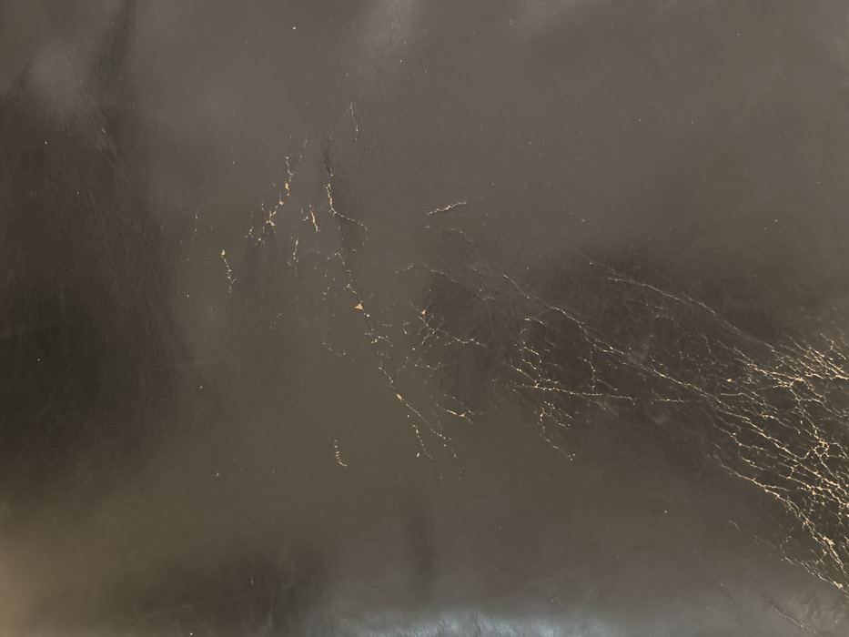 dark, possibly leather or vinyl surface. It appears to be damaged, with scratches and areas where the top layer is peeling or cracked, revealing a lighter-colored material underneath. The damage is concentrated in the center and along the right side of the frame, creating a web-like pattern. The overall impression is one of wear and tear on a once smooth surface.