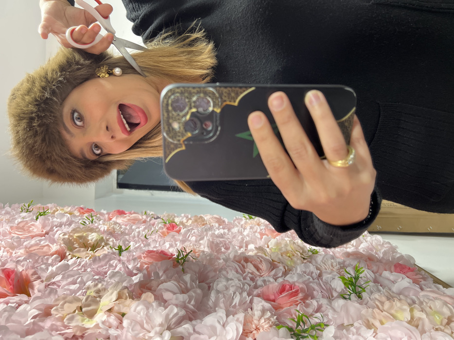 A woman is depicted taking a selfie indoors in Caen, France. She has shoulder-length blonde hair and is wearing a brown fur hat and a black ribbed garment. Her facial expression shows wide eyes and an open mouth with red lipstick, suggesting a playful or exaggerated grimace. On her right ear, she wears a gold-colored earring with a pearl drop. She holds a dark-colored smartphone with a decorative case, featuring a gold patterned border and a green star, in her left hand, angled towards her. On her left ring finger, she wears a gold band and a tri-color ring. Her right hand holds a pair of small scissors with white handles near her right ear, positioned above her hair. The immediate background to the left features a wall densely covered with artificial pink and light-colored flowers, interspersed with green foliage. A plain white wall or doorway is visible further to the right.
