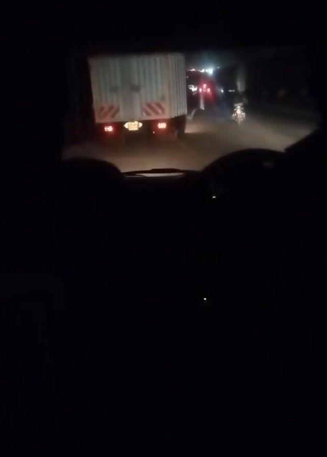 From the interior of a vehicle, a night-time scene reveals a large truck ahead, its taillights visible. A person is briefly visible near the truck. Other vehicles pass in the distance. The overall lighting is dim, typical of a night drive.