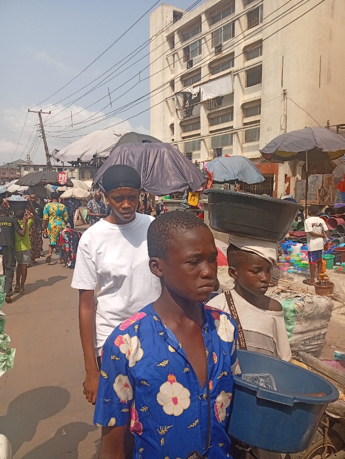 A bustling outdoor market scene displays a mix of people and vendors under an array of umbrellas. A building with multiple windows looms in the background. In the foreground, two young individuals carry blue tubs, and another carries a black tub on their head. A woman in a white shirt stands among them. The scene suggests a busy day of commerce and daily life.