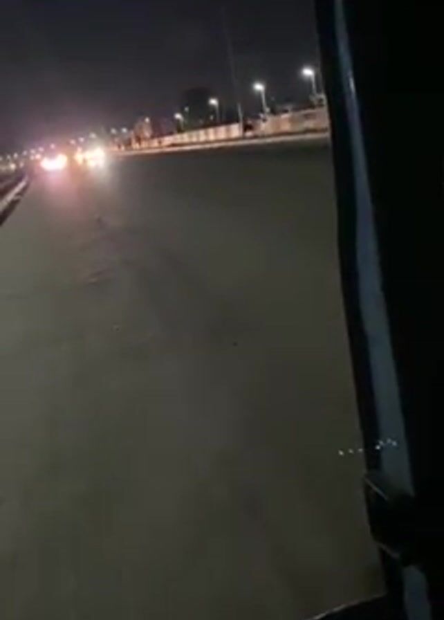 The video, shot at night, shows a view from a vehicle parked on the side of a paved road