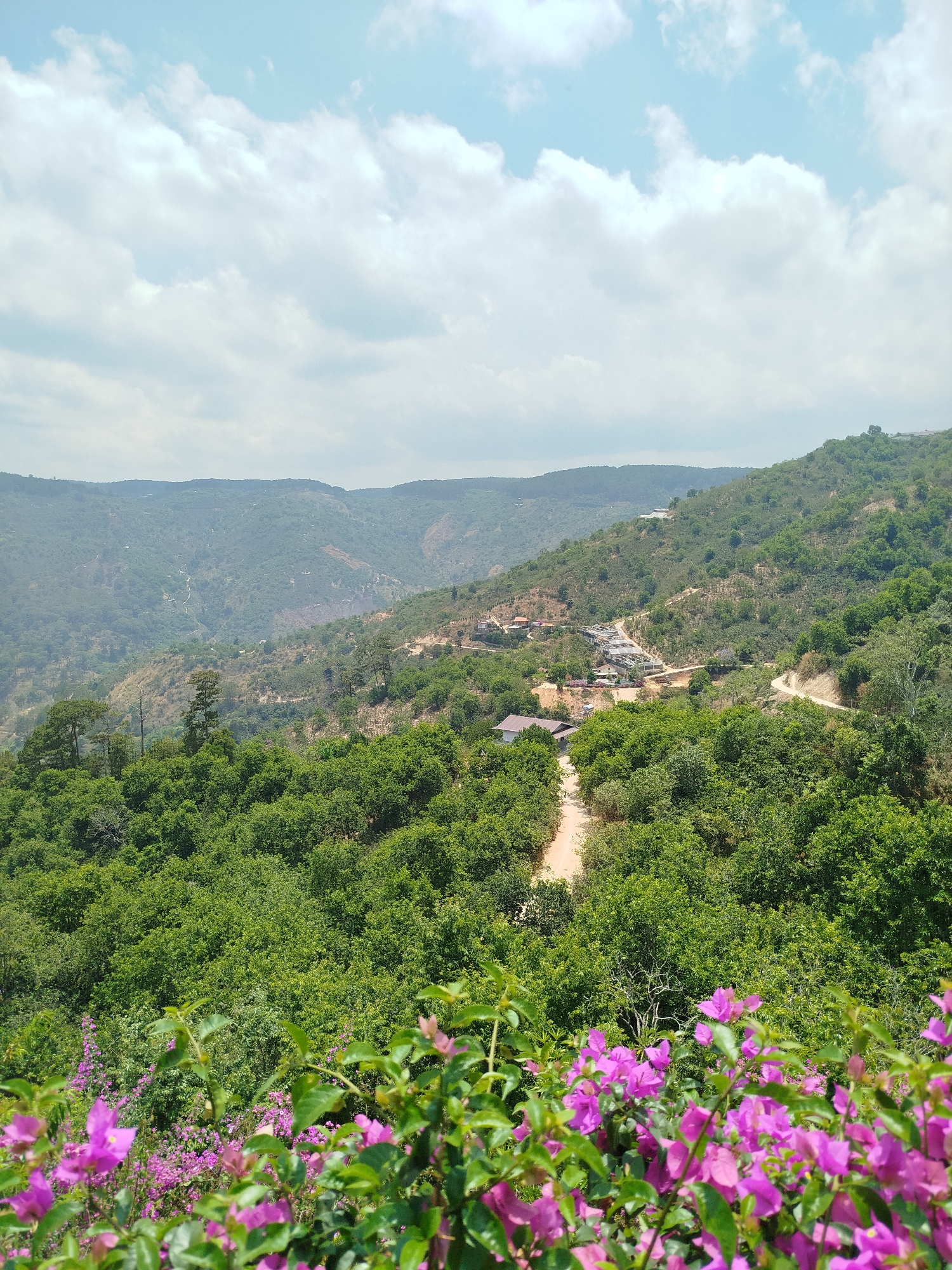 The image depicts a scenic landscape in Phát Chi, Vietnam. The foreground features vibrant purple bougainvillea flowers with green leaves, creating a colorful frame. Behind the flowers lies a dense green forest, obscuring the terrain. A dirt road cuts through the trees, leading towards a cluster of buildings and residences further up the hillside. In the background, rolling hills covered in trees stretch into the distance under a bright, blue sky with scattered white clouds. The sky dominates the top half of the image.