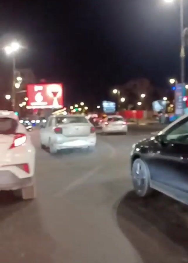 The video is shot from the perspective of someone riding a motorcycle at night. The rider is in traffic, surrounded by cars. Streetlights illuminate the scene. There is a roundabout with some greenery. A red billboard is visible in the distance. The rider follows the flow of traffic, passing cars on the side. The overall light is low, creating a somewhat blurry visual effect.